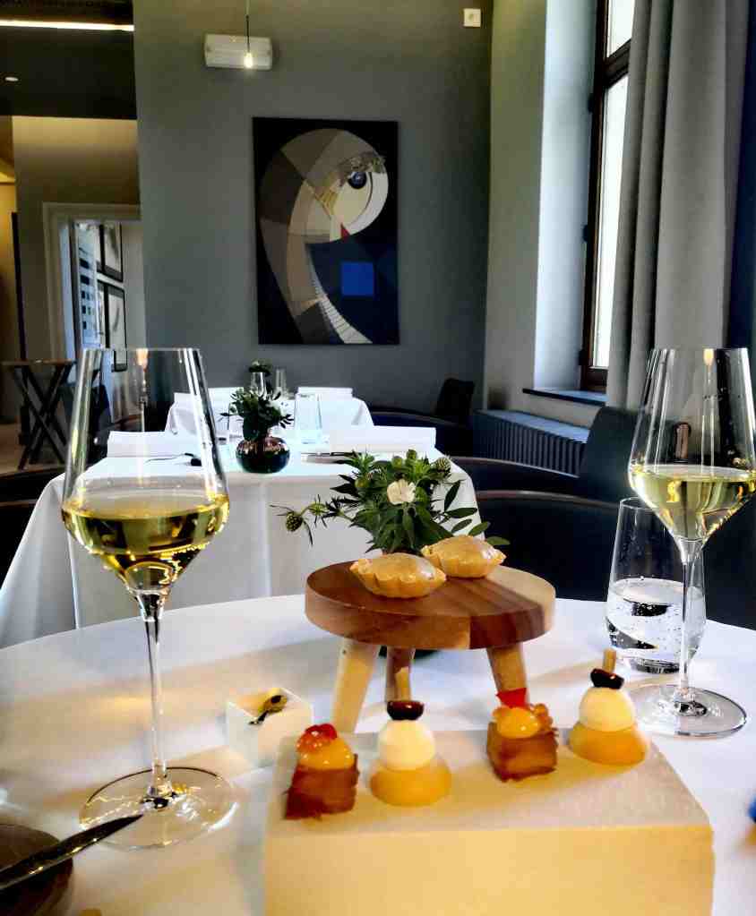 En ce mois d’avril, le chef déroule un menu de printemps 3, 4 ou 5 escales, où chaque plat suscite un bon coup de fourchette. Les assiettes sont colorées, fraiches, joyeuses. Gros coup de saveurs pour le ceviche de maquereau/riz soufflé/crémeux de raifort/gelée de gingembre et les asperges vertes de Carpentras/ morilles jaunes farcies à la pistache/ foie gras/ vin jaune du Jura. Le veau de lait de Lozère, d’une tendreté parfaite, déploie des arômes subtils et se marie harmonieusement avec des asperges blanches, du miso, un flanc au cresson et une croquette de boudin noir.