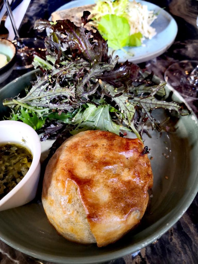 On attaque direct avec des asperges de Malines, croquantes comme il faut, boostées à l’ail des ours et aux amandes toastées et notre compagnon se laisse tenter par un pâté en croûte bien généreux : canard, foie gras et noisettes, rien que ça !