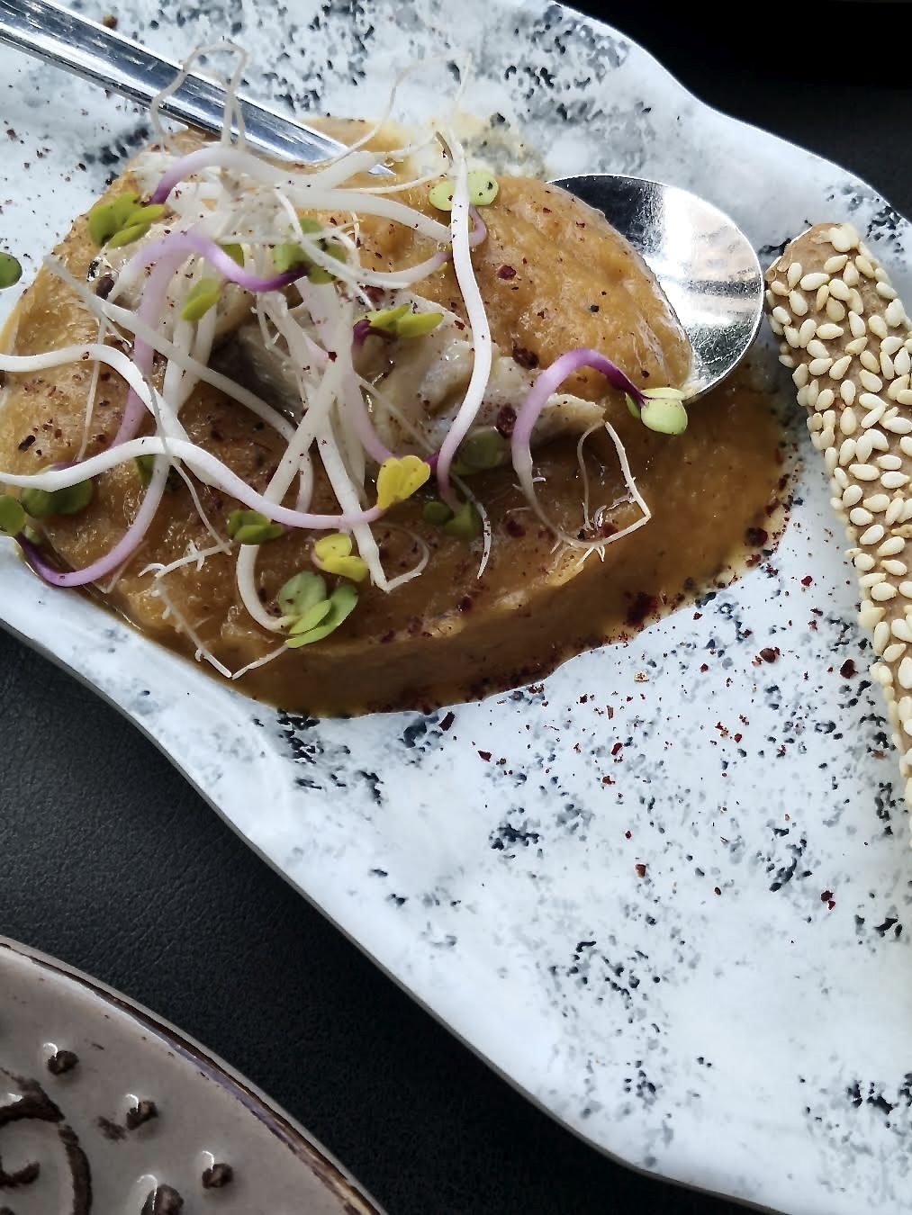 Dès l’apéro, un ouzo – la madeleine de Proust de nos vacances à Naxos – et on oublie vite qu’on est en ville. Les entrées annoncent la couleur : pois cassés (la fameuse fava) de Santorin avec poisson salé ou frittata crétoise ? On opte pour le katsochiri, un fromage crétois servi avec des boucles de courgette et une confiture de betterave – bingo !