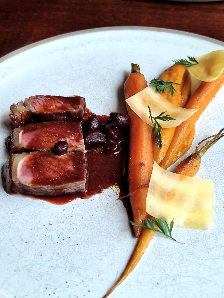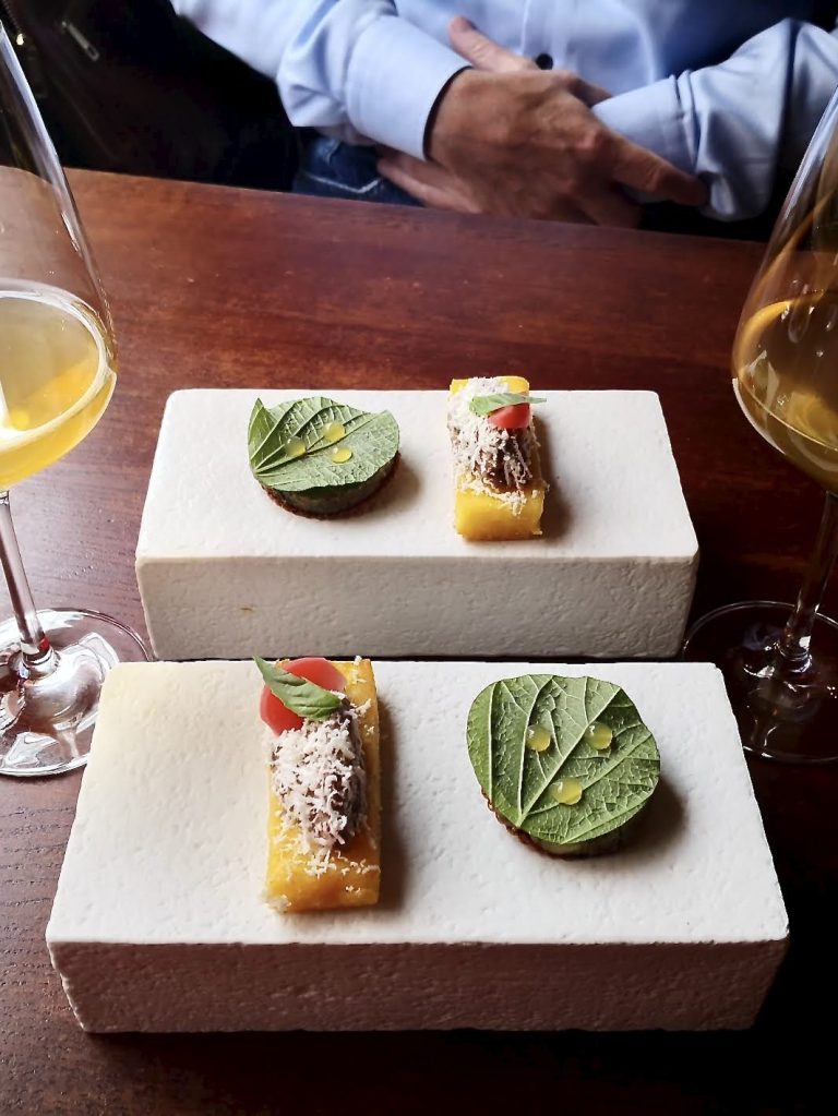 Dès les premières bouchées, le chef Alexandru prouve qu’il aime les goûts bien affirmés : polenta crémeuse grillée, coiffée de foie de cochon, pickles maison, et cracker tête pressée, feuille de shiso, émulsion gingembre & curcuma. Ambiance cochonnailles fines, on adore.