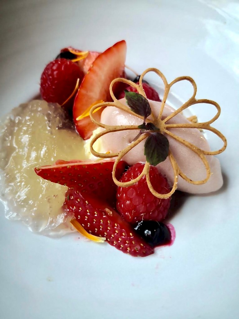 Le dessert ? Un cheesecake audacieux et inoubliable : fromage de chèvre et de Herve, et une farce qui change selon la saison. En juin, c’est rhubarbe, pour le côté acidulé qui réveille les papilles en beauté. Original et ultra ultra ultra gourmand. Une assiette fruits rouges et calendula, clôture ce lunch en douceur et en fleurs.