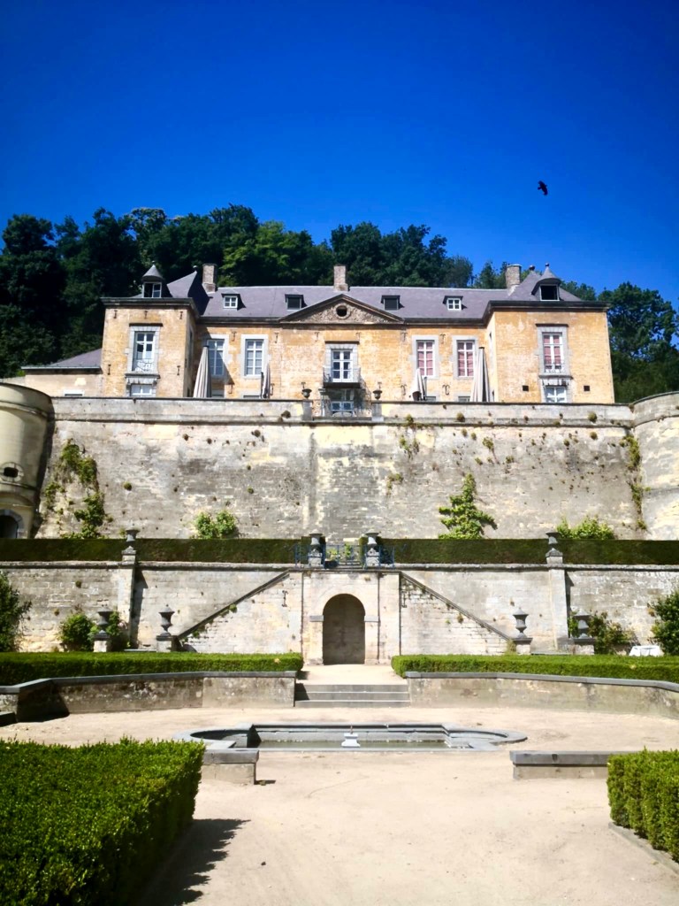 Passons à table. C’est l’été, les nappes sont tirées dans la cour du château, avec une vue imparable sur les jardins et la vallée du Geer. Rien à redire : c’est somptueux, presque irréel.