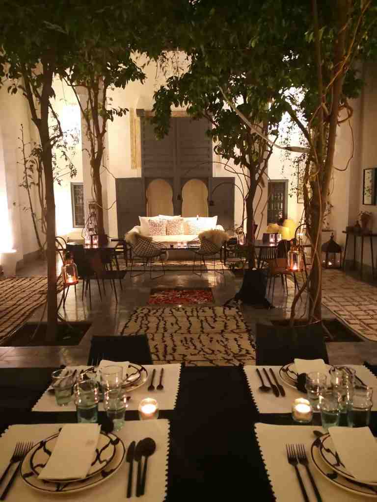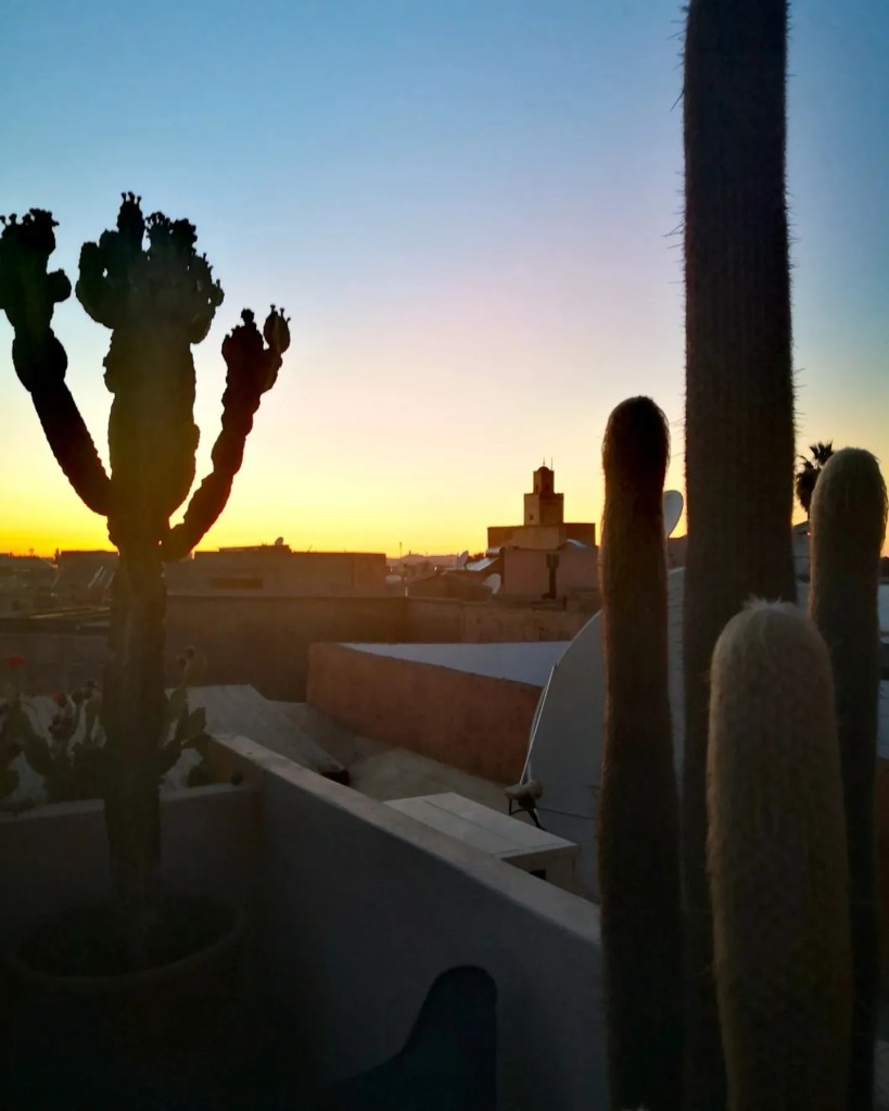 Très vite, Dar Kawa fait tomber les défenses : on est ici chez soi. Massage sur la terrasse, produits bio à l’appui, petit-déjeuner dans le patio autour des crêpes marocaines de Saïda, et dîners servis par la brigade maison, en table d’hôtes, pour croiser d’autres voyageurs et refaire le monde dès l’apéro. Le petite verre, un rituel, incontournable : un vin gris à la main, face aux toits de la médina qui s’embrasent à la tombée du jour. En bas, la Ville Ocre s’agite; en haut, sur le rooftop, le temps suspend son souffle.