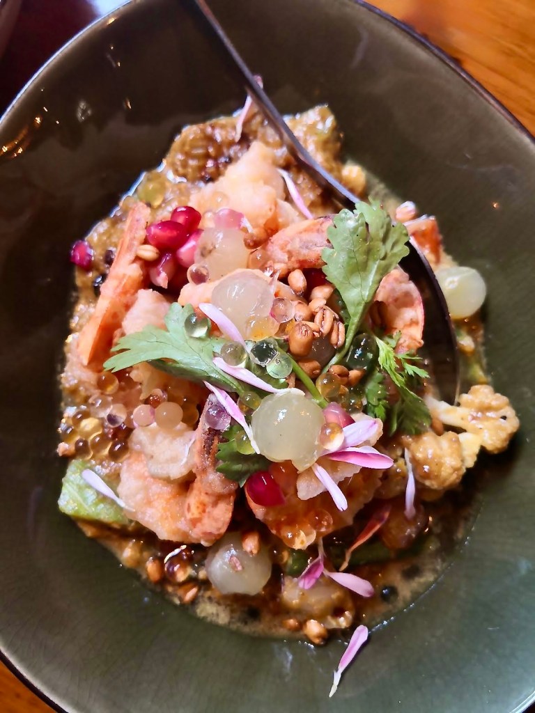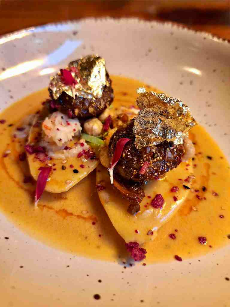 Ce dimanche, on attaque avec des croquettes de scampis dans un curry rouge maison — c’est le meilleur jamais savouré. En face, un gravlax de saumon qui envoie du peps : herbes, citron vert, émulsion aux agrumes et whisky thaï. Un feu d’artifice.