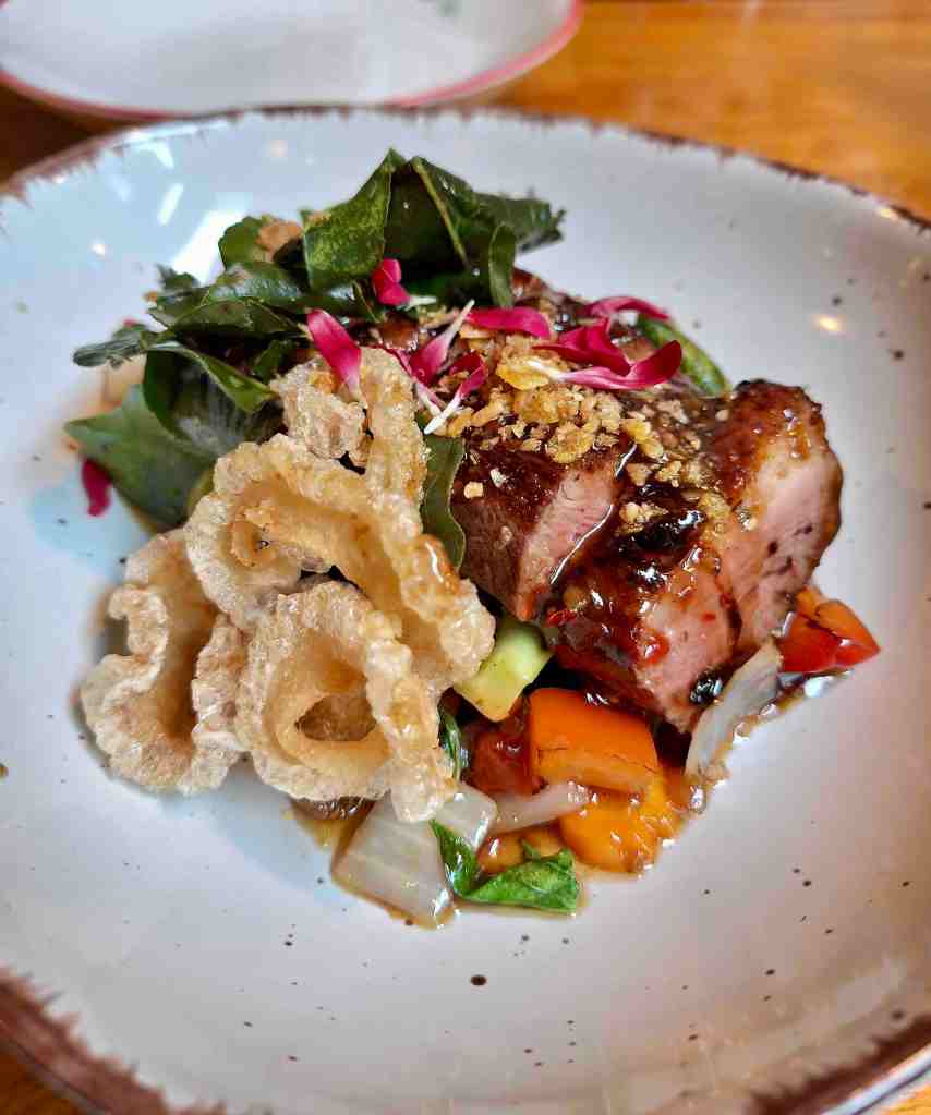 Retour au calme. Le Laab Kaï débarque avec son poulet haché, menthe, coriandre et piment : frais, vif, bien balancé… Il sait se faire remarquer sans vous griller les papilles. Le canard au basilic thaï entre en scène : juteux, intense, parfumé — chaque bouchée mérite son coup de fourchette impatient.