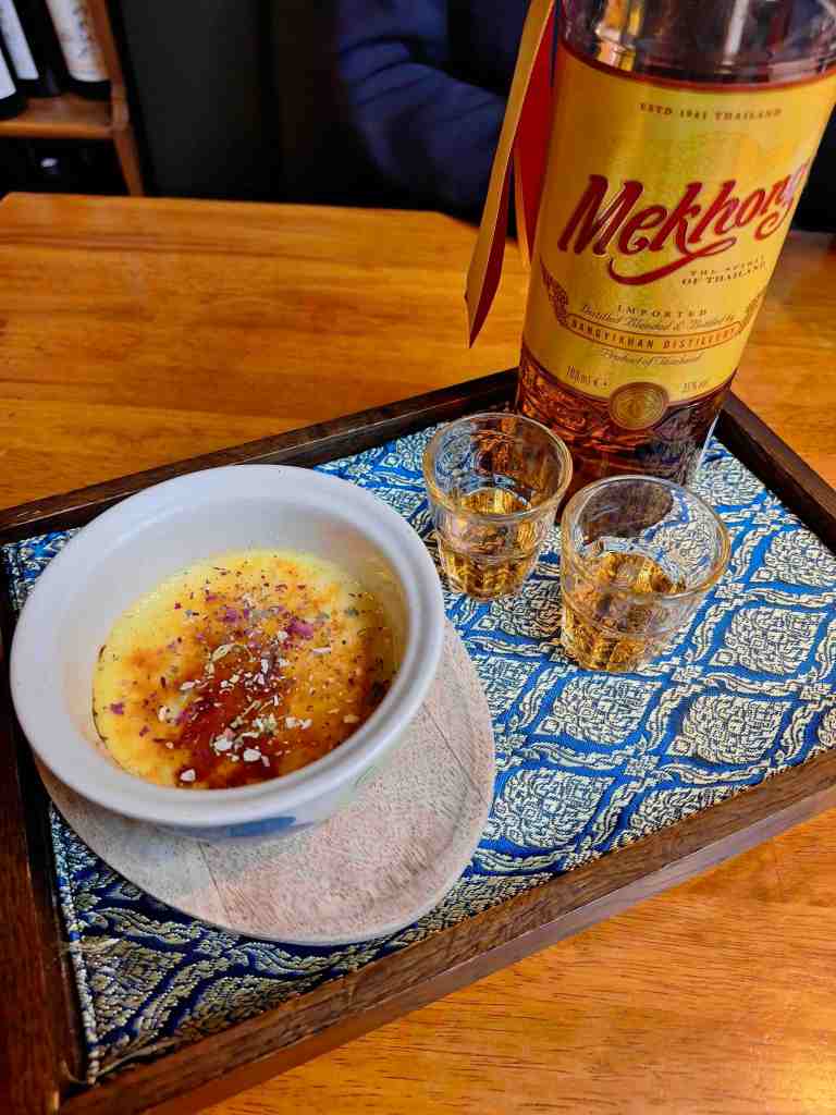Tan revient et lève le rideau sur un ovni culinaire : ravioles de homard chic, boudin gris rustique, épices thaïes, réunis dans un plat canaille d’ici et de là-bas. Un grand écart redoutable, entre finesse et caractère. Pour finir, une crème brûlée au jasmin et thé bleu, escortée d’un petit shot de Mekhong.