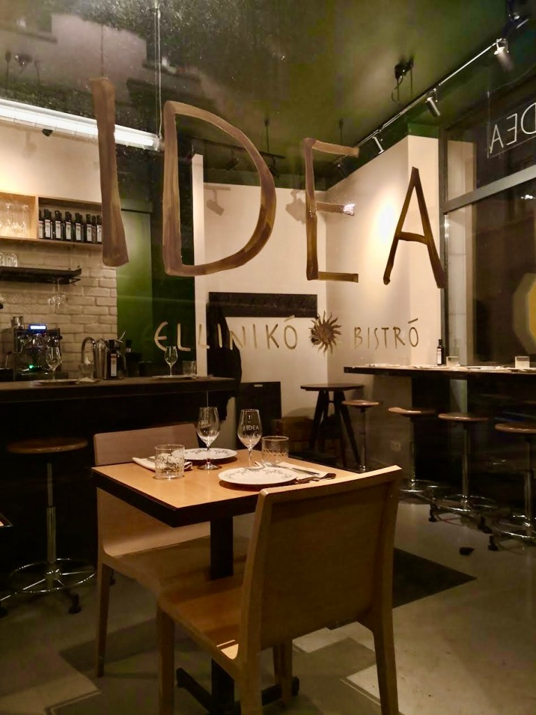 A la carte, du classique, oui, mais jamais sans un pas de côté assumé. Une moussaka, oui mais végétarienne, un coquelet, oui mais escorté d’okras. Et. aussi : des saucisses maturées venues de Drama, du poulpe nappé d’huile de truffe… Une Grèce moderne qui revisite ses classiques sans pour autant oublier ses racines. Idea joue en effet la carte de la richesse et de la diversité des terroirs grecs en mode bio, AOP et petits producteurs. Soit une véritable cuisine de produits importés directement de là-bas (huile d’olive d’Argolis, kopanisti — sorte de roquefort — de Mikonos, gruyère crétois, et vins grecs exclusivement) au prisme de la Modern Greek Cooking.
