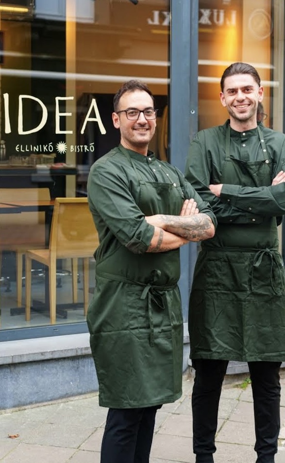 Ixelles, à quelques encablures du Parlement européen. Autant dire loin, très loin du soleil généreux des Cyclades. Ici, le quartier vit au tempo des déjeuners d’affaires : bouillonnant à midi, sage le soir, désert le week-end. Ouvrir un restaurant dans ce coin de Bruxelles tient donc du pari. Un pari calculé pour Costantinos Maghioros, fondateur d’Idéa, la trentaine bien assumée. Pas un inconnu dans le milieu de l’horeca : on lui doit aussi Ergon, l’enseigne bruxelloise dédiée aux produits artisanaux grecs. À ses côtés, une équipe fidèle depuis plus de dix ans. Et, en cuisine, un renfort plus récent : Nikolaos, passé par de belles maisons athéniennes.